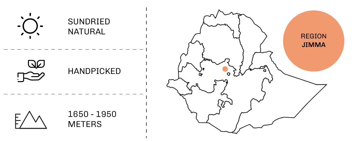 Sweet and round with notes of nougat and chocolate. A naturally processed coffee from the Jimma region, produced by smallholder farmers with a focus on quality and sustainability.
