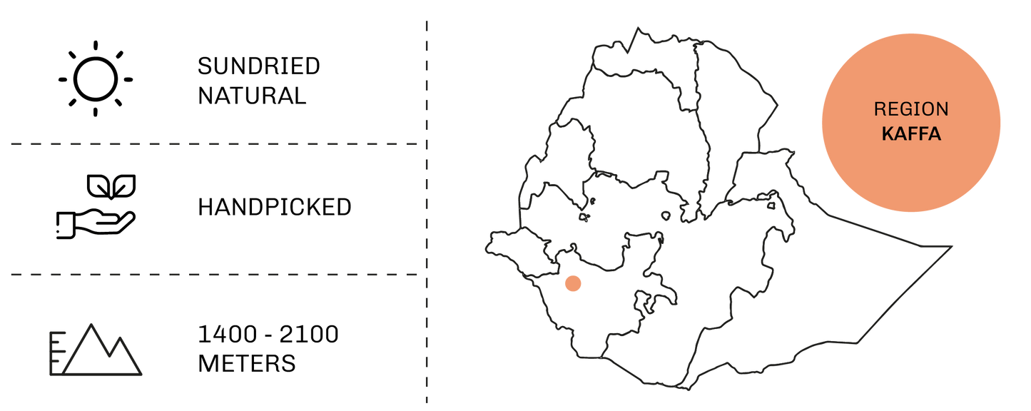 Delicate and sweet coffee from Ethiopia’s original coffee forests. Notes of dark chocolate and wild berries capture the natural terroir of the Kaffa region, where coffee has grown for centuries.